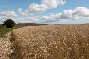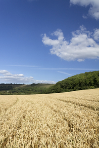 Inglaterra Inglês Triticum campo cereal colheita crescente em desenvolvimento fazenda grã bretanha paisagem plantas sussex trigo vegetação verde South Downs campos colinas parque nacional verão cabeças grão maduro talos pronto amarelo céu dourado nuvem orelhas