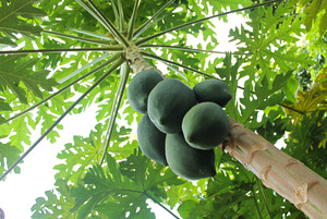 Mamões verdes crus na árvore
