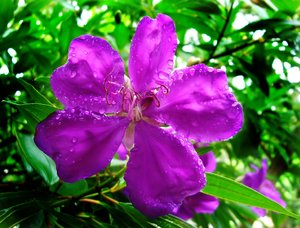 Flor com gotas, Tibouchina, ame, ao ar livre, arbusto, bonita, bonito, botânico, chuva, criação, dez pain, flor, flor, flor, floral, flores, folhagem, fresca, gotículas, jardinagem, mola, natureza, paz, pingos de chuva, plantas, pétalas, roxo, tempo, umidade, verde, verdura, verão
