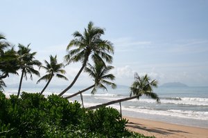 Palmeiras Tumbledown, China, Hainan, areia, baía, convidativo, costa, costa, em ruínas, escorou, fronda, férias, férias, lazer, natureza, onda, ou, palma, perto, praia, tronco, tropical, verão, árvore