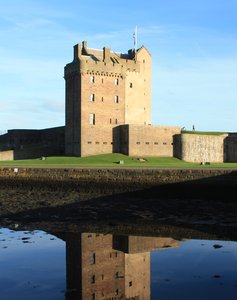 Broughty Ferry Castelo, Broughty, Dundee, Escócia, ainda, alga, azul, balsa, bandeira, castelo, claro, céu, defender, defesa, escocesa, espelho, foi, fortaleza, forte, grama, janela, luz do sol, mastro de bandeira, mão, ou, parede, paredes, pedra, pistola, porto, reflexão, rio, sol, torre, torreão, violência, água