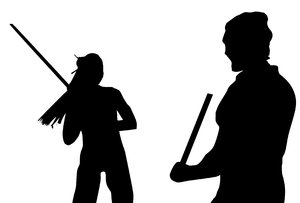 Lutando com uma vara, artes marciais, duelo, forma, guerreiro, isolado, luta, lutadores, marcial, menina, meninas, silhueta, sombra, vara