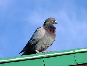 Pombo, azul, cinza, céu, ensolarado, pombo, pássaro, telhado