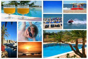 Cartão do feriado, areia, beira-mar, diversão, esportes, felicidade, férias, férias, ou, praia, sol, verão, água