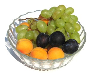 fruteira, ameixas, damascos, fruta, frutas, tigela, uvas