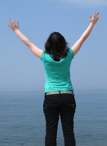 big blue, aberto, atingindo, atrás, beira-mar, bem-vindo, brasão, de volta, em pé, esticada, feminino, fé, menina, mulher, mãos, ou, saudação, traseiro