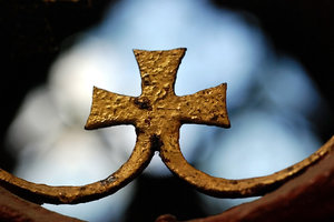 Cruz dourada Velho, Alemanha, Magdeburg, aplica-se, atravessar, decoração, detalhe, dourado, engradado, ferro, gelosia, grade, grade, grade, latada, metal, ouro, paz, portas, portão