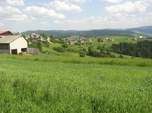 Aldeia Vale, Istebna, Jaworzynka, Polônia, aldeia, campo, casa, casa, casas, colina, céu, grama, montanha, montanhas, planta, plantas, quente, vale, vale estreito, verão