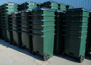 Dustbinds 1, Caixotes, alinhar, bins, forrado, linhas, lixo, lixo, roda, rodas, verde