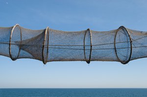 Rede de pesca, azul, cilindro, covos, céu, equipamento, geat, hoops, labareda, líquido, oceano, ou, pescaria, pescaria, suspenso