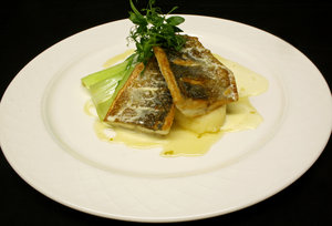 Baixo, badejo, badejo, baixo, carne, chapa, filé, legumes, molho, ou, peixe, pele, potatto, restaurante