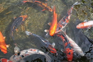 Peixe-dourado, Noruega, branco, congregar, decorativo, grupo, laranja, manchado, natação, ornamental, peixe, peixe-dourado, piscina, prata, reunir, água