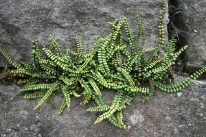 Samambaia parede, Asplenium, Gloucester, Gloucestershire, Inglaterra, avenca, fronda, parede, pedra, penas, pinadas, planta, remoto, velho, verde