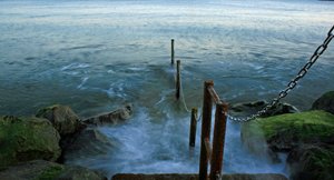 Enferrujado, alga, cadeia, grades, longa exposição, metal, não, oceano, ou, paz, posto, rochas, trilho