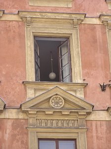 Uma janela, aberto, abriu, casa, casa, construção, histórico, janela, lâmpada, parede, teto, velho