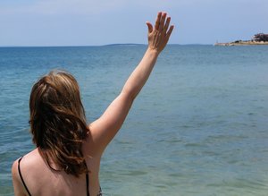 waveing, beira-mar, bikini, braço, costa, esticada, feminino, mulher, mão, onda, saudação, verão, waveing