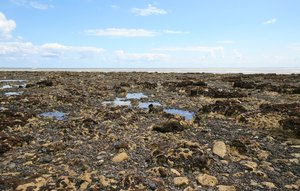 Rockpools e mariscos, Inglaterra, alga, algas, baixo, costa, costa, céu, exposto, grã bretanha, kent, marisco, maré, mexilhão, molusco, natural, natureza, ou, paisagem, party rock, pedra, pervinca, rocha, somente, água