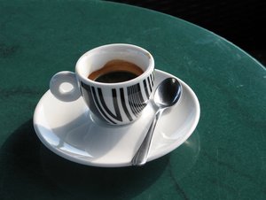 café tarde, bebida, café, café, colher, copo, expressaram, preto, quente, tabela
