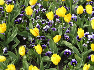 Canteiro de flores, amor-perfeito, azul, flor, flor, flores, folha, folhas, fundo, mola, natureza, papel de parede, plantas, pétalas, roxo, tapete, telha, textura, tulipa, tulipas, tótós, verde