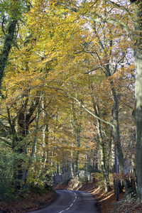 Pista do outono, Castanho-avermelhado, Fagus, Inglaterra, cair, cerca, cobre, cor, curvatura, declive, direção, estrada, faia, faixa, floresta, folha, folhas, fulvo, grã bretanha, madeira, ouro, outono, rota, rural, sussex, viagem, árvores