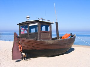 cortador na praia 2, areia, barco, cortador, de madeira, deserto, distância, horizonte, madeira, minúsculo, navio, ou, pescaria, praia, solitário, vazio, verão, água