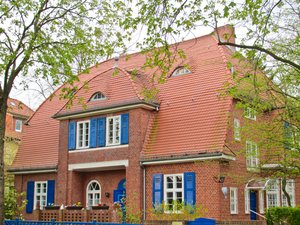 casa de tijolo rural, Berlim, Windows, arquitetura, atmosférico, azul, casa, casa, casas, clássico, construção, decorativo, decoração, edifícios, empena, fachada, idílico, janela, mansão, obturadores da tempestade, persianas, pintado, representante, representação, rural, telhado, telhados, tijolo, vermelho, vila