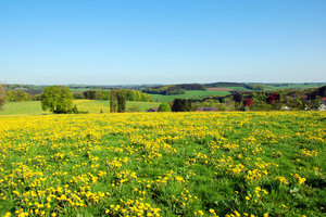 Primavera caminhada, agricultura, amarelo, andar, campo, cenário, colorido, dentes de leão, flores, grama, idílio, mola, paisagem, prado, sol, verde