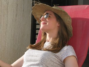 no terraço, curtimento, espreguiçadeira, feminino, jovem, menina, mulher, retrato, sessão, sol, terraço, tomando sol, vacations, varanda, verão, óculos de sol