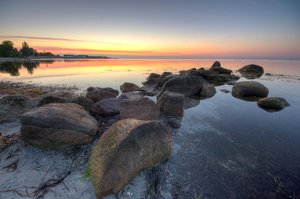 manhã calma - HDR, Nyberg, alga, calma, costa, costa, estacada, hdr, litoral, morto, nascer do sol, oceano, ou, pedras, rochas, água, árvores