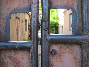 buraco na porta, abriu, buraco, enferrujado, fechadas, furos, por, portão, rua, vazio, vista