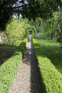 Trajeto do jardim, Buxus, Inglaterra, Inglês, arco, caixa, caminho, característica, cascalho, cerca viva, escuso, grampeado, grã bretanha, hampshire, jardim, mola, plantas, projeto, pérgola, sombra, telha, verde, árvores