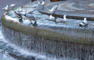 fonte gulls3, Chroicocephalus-novaehollandiae, Larus novaehollandiae-, agressivo, assistindo, australiano, aves, aves aquáticas, aves marinhas, barulhento, borda, bordas, cascata, catadores, cidade, cinza e branco, cinza e branco, comum, cores, cores, corrente, debrum, em pé, espera, fluir, fonte, gaivotas, gaivotas, guinchando, legal, luz, multi-nível, níveis, ondulando, ondulações, prata-ouro, prolífico, rasa, reflectindo, resfriamento, salpicos, água