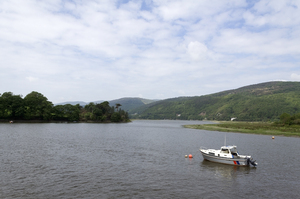 Estuário, Mawddach, atual, barco, colinas, céu, estuário, floresta, galês, lançamento, marés, nuvens, ondulações, país de Gales, rio, verde, água