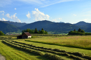 ceifa do feno, agricultura, aldeia, cabana, campo, campo, colheita, céu, flores, grama, há, montanhas, nuvens, prado, verão, árvores