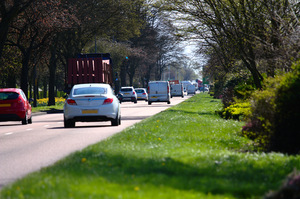 O tráfego urbano, Kingsway, a partir de, arbustos, automóvel, beira, caminhão, caminhão, carro, carro, carros, cidade, congestionamento, dual, estrada, faixa de rodagem, macadame, rota, transporte, tráfego, urbano, árvores