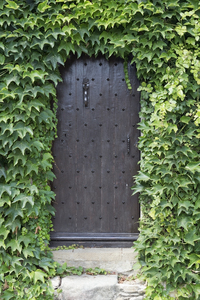 Porta espanhola velha, Catalonia, Espanha, alpinista, antigo, arquitetura, batente, casa, catalunha, catalão, cercado, coberto, cravejado, de madeira, decadência, declínio, desuso, elementos, espanhol, hera, histórico, negligência, passo, pedra, planta, por, trepadeira, velho