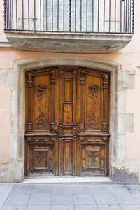 Porta espanhola velha, Catalonia, Espanha, antigo, arco, arquitetura, calçada, casa, catalunha, catalão, de madeira, decadência, declínio, decorativo, desuso, elementos, espanhol, histórico, laje, negligência, ornamentado, passo, pedra, por, varanda, velho