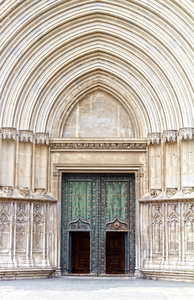 Entrada da igreja, Catalonia, Espanha, antigo, arcos, arquitetura, casal, catalunha, catalão, cravejado, cristão, de madeira, decorativo, dois, entrada, espanhol, grande, igreja, ornamentado, par, pedra, portas, religioso, religião
