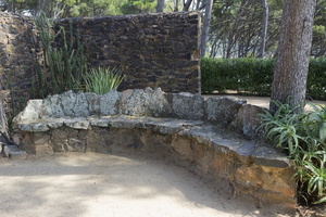 Banco de jardim, Espanha, arquitetura, assento, curvo, elementos, espanhol, jardim, parede, pedra, resto, sombra