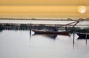 pesqueiro, barco, barco de pesca, casa, céu, lago, lua, paisagem, reflexão, água