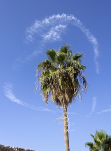 Palma com um coração, Akko, Israel, azul, contrails, coração, céu, folhas, forma, palma, árvore