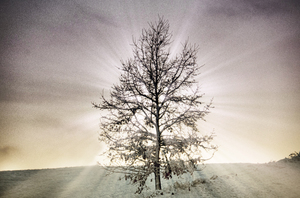 árvore só, crepúsculo, céu, frio, inverno, luz, natureza, neve, raios de luz, árvore