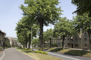 Rua em uma colina, Inglaterra, Inglês, Wiltshire, aldeia, arquitetura, baixa, caminho, casas, casas, chalés, cidade, colina, declive, estrada, grã bretanha, histórico, lima, passeio, pedra, rua, terraço, tilia, tília, velho, árvores, íngreme