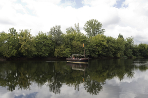 Barco de turista, Dordogne, França, Gabarre, barco, calma, céu, explorar, flutuador, francês, lânguido, navio, nuvens, pacífico, reflexões, rio, tradicional, tranquilo, turismo, turistas, verde, viagem, água, árvores