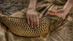 carpa comum, aterrado, balança, captura, capturados, carpa, mapeada, mãos, para, peixe, pesca, pescaria, segurar, tom, viscoso