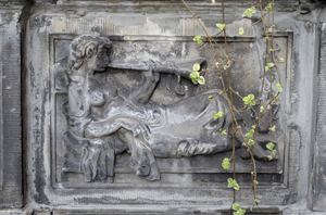 Menina que joga o chifre, chifre, cinza, decoração, folhas, menina, parede, pedra, verde