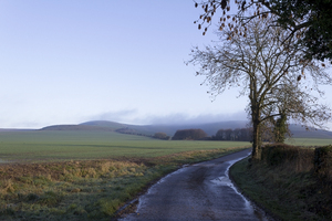Estrada secundária, Inglaterra, Inglês, Wiltshire, campos, cerca viva, colinas, cultivo, estrada, faixa, fazenda, grã bretanha, inverno, luz, luz solar, manhã, molhado, paisagem, país, rural, árvores