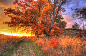 Por do sol colorido do outono