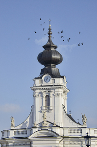 Igreja em Wadowice, aves, céu, estátua, igreja, nuvem, relógio, santo
