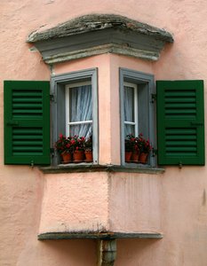 por trás cortinas-, aberto, alcova, arquitetura, baía, bowfront, casa, construção, construção, cortinas, detalhe, exterior, face, fachada, fechar-se, flor, galeria, janela, lata, objeto, panejamento, persiana, persianas, quadro, velho